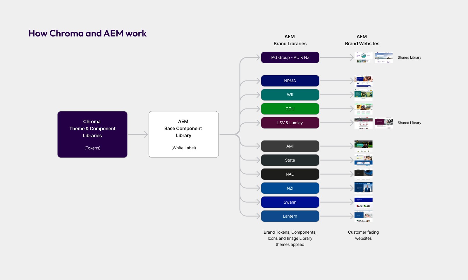 When I joined IAG, the challenge was clear. We needed to create a scalable design system that could power 12 brands, including NRMA, CGU, and RACV, while reducing complexity for both designers and engineers. I led the initiative end to end, shaping the strategy, implementation, and governance that transformed scattered libraries into a unified, tokenised system.