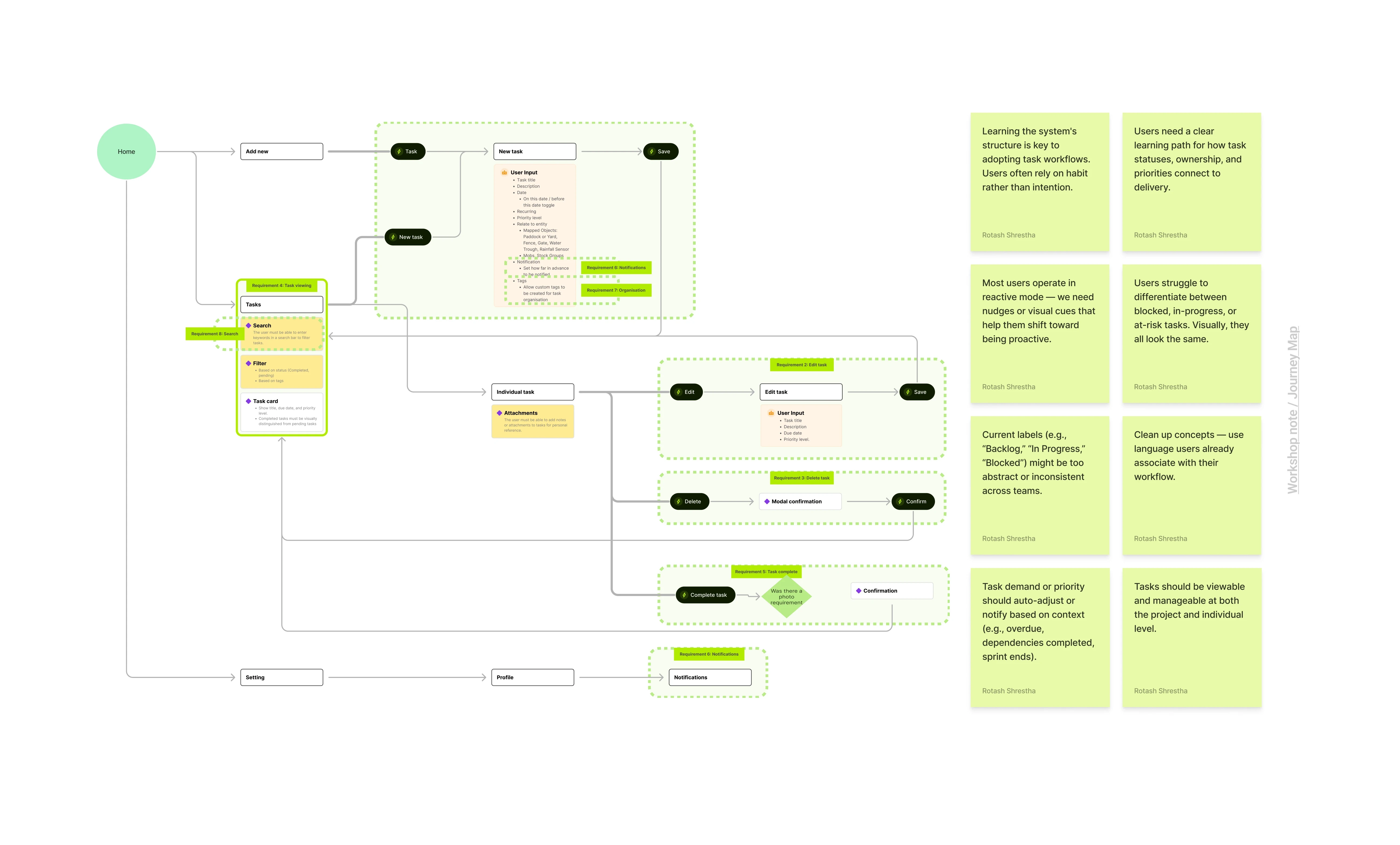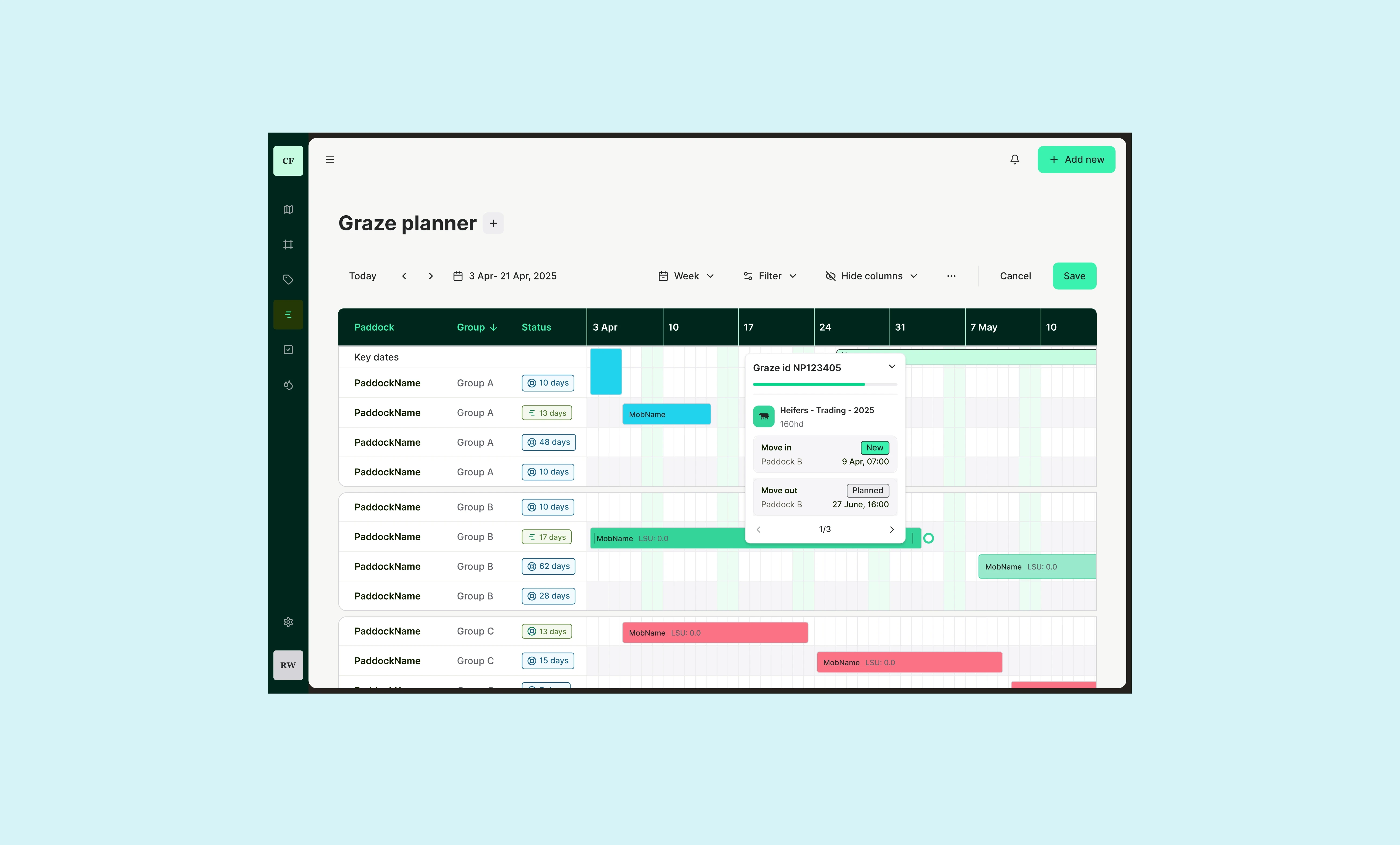 I led the full product design process from discovery through to a validated MVP. Deep research: I listened first. I spoke with over 20 farmers: new users, long-term customers, churned users, and farmers using competitor tools. Internal teams also helped map where the product was falling short and where the biggest opportunities lay. Mapped user maturity: Rather than focusing only on features, I designed around real user journeys. What does a first-time grazer need to feel confident? What keeps a carbon project lead in control? These questions shaped the experience. Redesigned the experience: I rebuilt core flows for grazing plans, mob movement, and task tracking, merging disjointed tools into one seamless view. Design principles: I created six principles that acted as a north star. Ideas like “Mentor, not Manual” and “One Task, One Screen” kept the team aligned and ensured we were designing with the farmer’s mindset at the center.